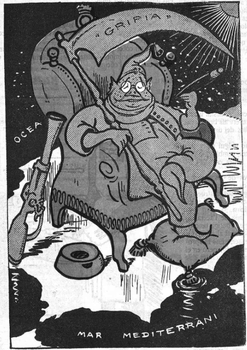 Because wartime censorship was less strict in Spain, more newspapers reported on the rising epidemic of influenza in 1918, and much of the rest of Europe thus came to refer to it misleadingly as the “Spanish flu.” But in Spain itself the occasional Orientalism remained useful in depicting the origin of the disease. (La Esquella de la tarratxa, Barcelona, 11 October 1918)