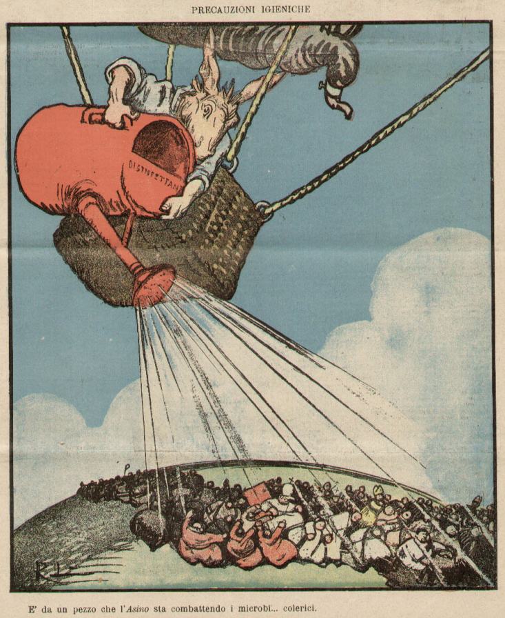 Really wandering beyond my ken here, but I find this image from the Italian satirical magazine L’Asino rather amusing. The eponymous mascot is pouring disinfectant on what seems to be a very clerical populace below. The caption reads, “It has been a long time that The Ass has been fighting against microbes… cholera microbes.” (I imagine there is word play on the sense of “choleric” here, but I don’t speak Italian.) The magazine was stridently anticlerical, and the winking implication is that it has been doing battle with metaphorical contagions, while cholera (the sixth pandemic then touching mainly the easternmost portions of Europe) was a literal latecomer.
