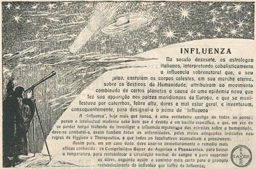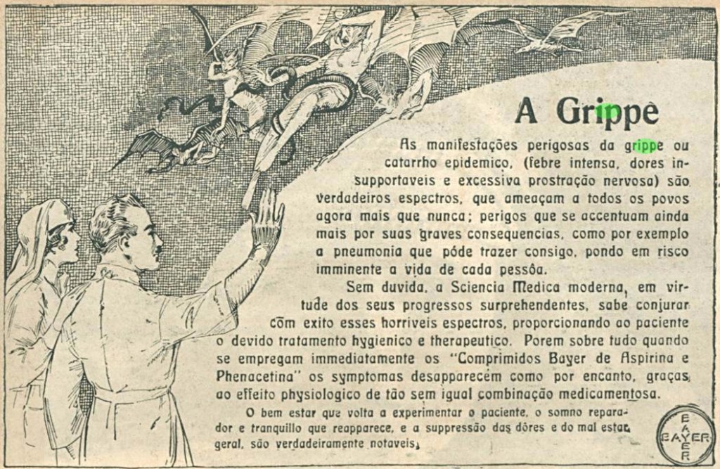 Banishing the demons in this advertisement by Bayer in Rio de Janeiro during the Spanish flu epidemic. “Undoubtedly, modern Medical Science, thanks to its surprising progress, knows how to successfully conjure away these horrible specters…”