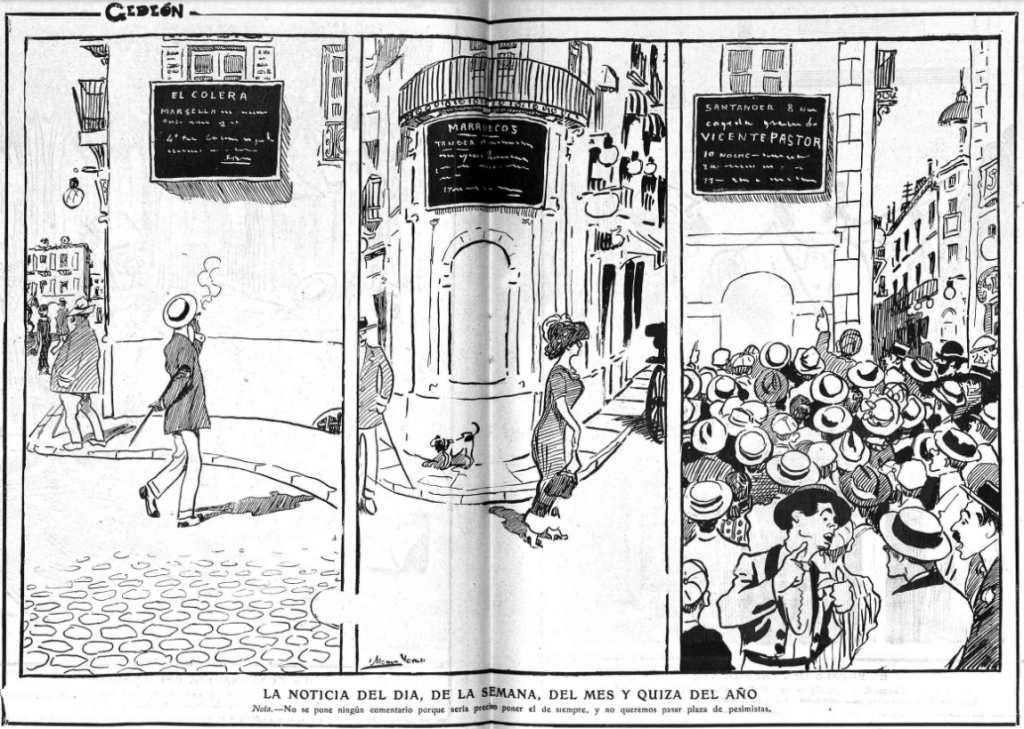 Cholera (left); Morocco (middle); Bank Santander market info, bullfighter Vicente Pastor (right)