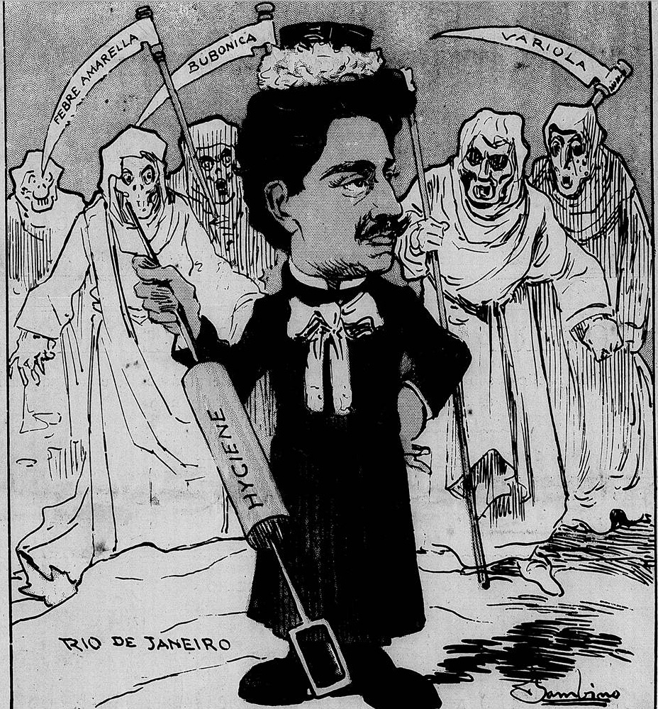 Yellow fever, plague, and smallpox stand arrayed in chorus against public health in the person of Oswaldo Cruz, the biologist and government official most closely identified with Brazil’s efforts to introduce obligatory vaccination.