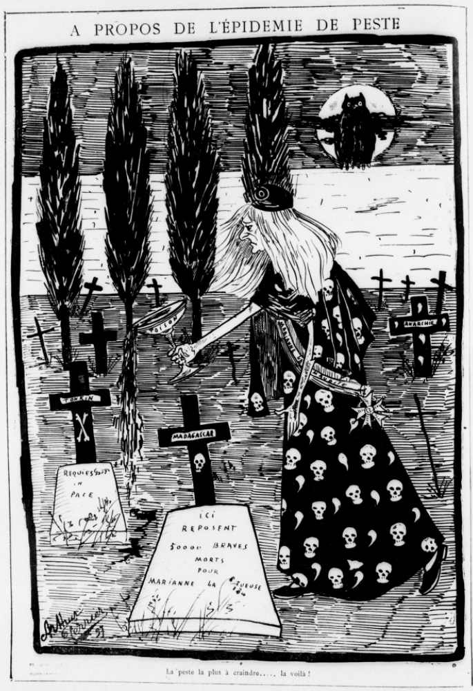 (The woman’s sash reads “Marianne the cursed,” and given the tombstones, this seems like a gesture toward the costs of French colonialism. In 1897 there was news of an outbreak of plague in India, sparking fears that it would make an appearance in Europe. The tenth international sanitary conference was held in Venice that same year, devoted to discussion of bubonic plague.)