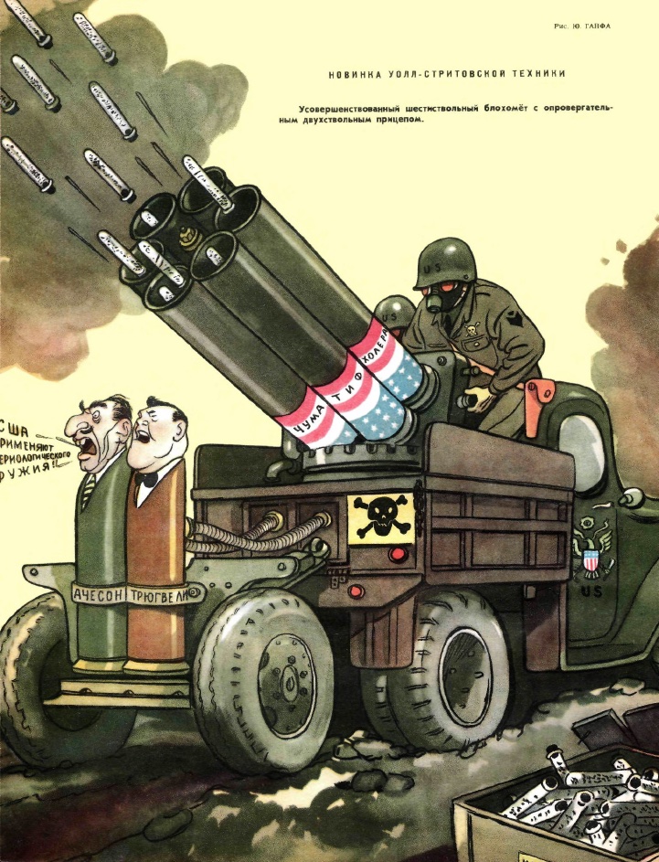 Ballistic cannisters labeled “plague,” “typhus,” “cholera.”