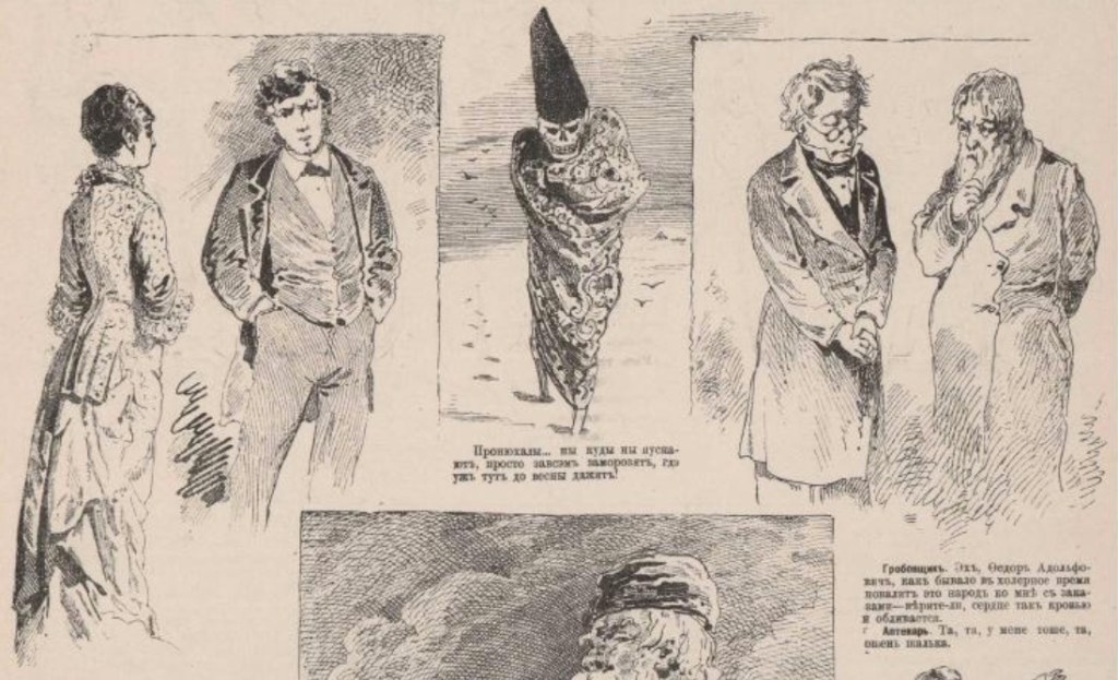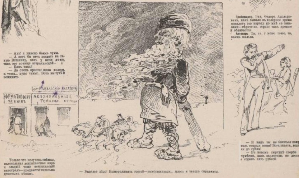 Right: Undertaker: “Eh, Fedor Adolfovich, just like when there was cholera, people are overwhelming me with orders, believe me, my heart is just overflowing.”