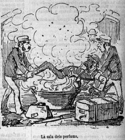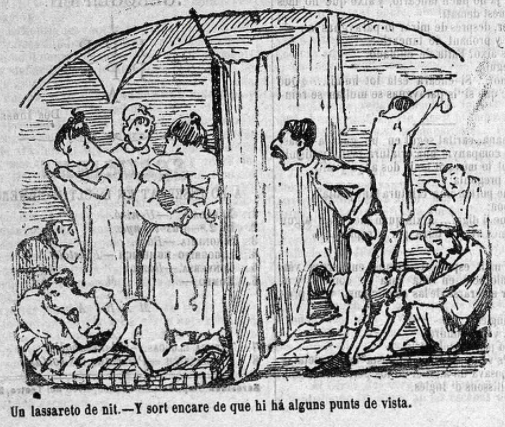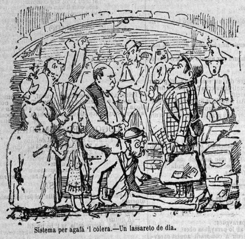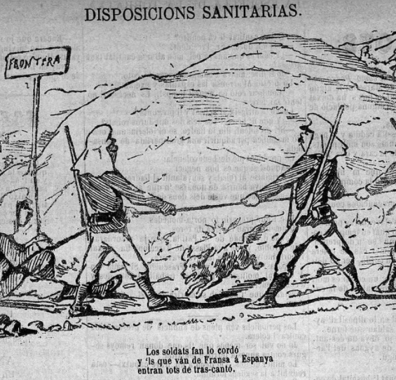 The soldiers make the quarantine cordon, and those who go from France to Spain all enter in improvised fashion. (La Esquella de la torratxa, Barcelona, 1884)