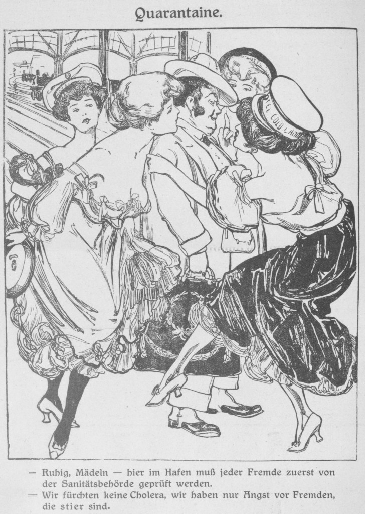 “Calm down, girls, every foreigner here in port must first be examined by the public health authorities.” “We’re not afraid of cholera, we’re only afraid of foreigners who are broke.” (Wiener Caricaturen, Vienna, 1911)
