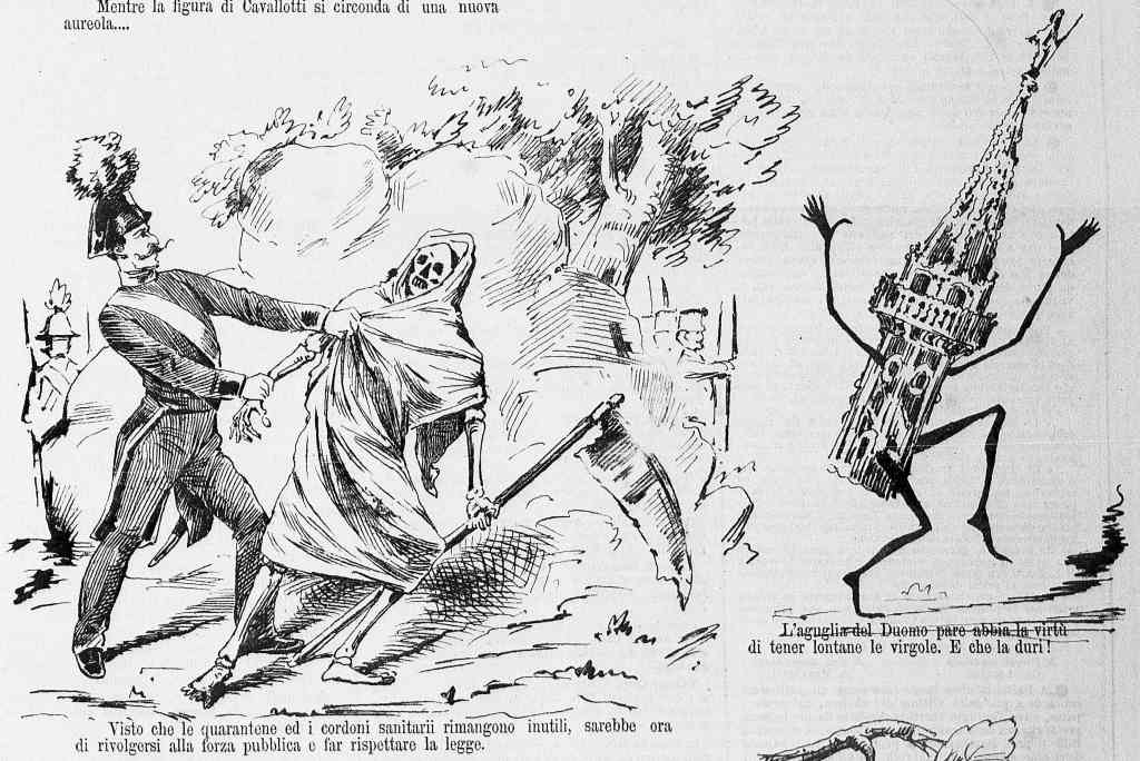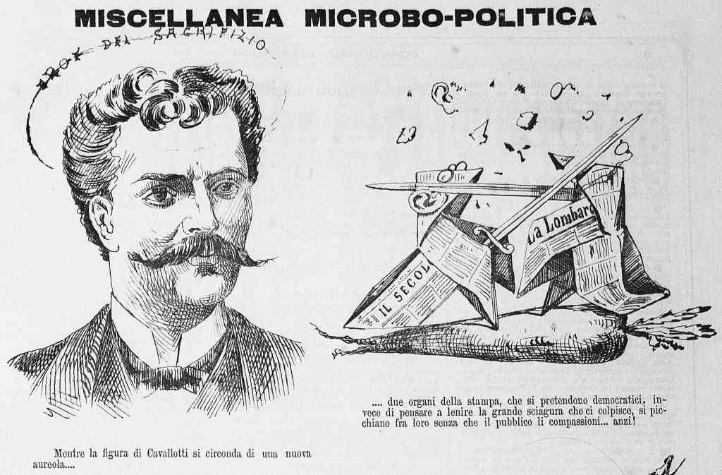 While the figure of Cavallotti surrounds himself with a new halo…. [Here labeled “Professor of Sacrifice,” leftist Italian politician Felice Cavallotti was notoriously combative and, as it happens, known for his gift for satire. It seems he led the fight against the cholera epidemic then underway in the city.]