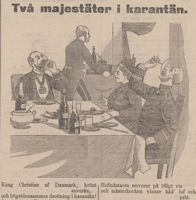 King Christian of Denmark, crowned sovereign, and equally exalted queen in quarantine! Yea, that the “Lord’s anointed” be placed there, is not a breach of majesty the same? It is believed that the purple itself, which the couple wears, is now loaded with cholera bacteria, and shall it be sulphurized, smoked, shall the king and his consort be soaked with carbolic acid?! Oh, their majesties feel pretty good, though it’s not as fun as in a castle. Delicious dishes and sparkling wine are common here, but not a single sign of cholera. The court master serves in the usual way and the master chef wins both praise and award. But of Mr. Koch’s bacteria, at the king’s throne, not even a portion is served here. There sits the adjutant with champagne glasses, which must always be in good company. And now you sound most gracious. Good year, yes, cheers! You eat and you drink everything you can tolerate. You can probably be quarantined, then so you can enjoy there, oh sovereign! With glass in hand, a roast fowl on fork, it is, on the whole, like a game.