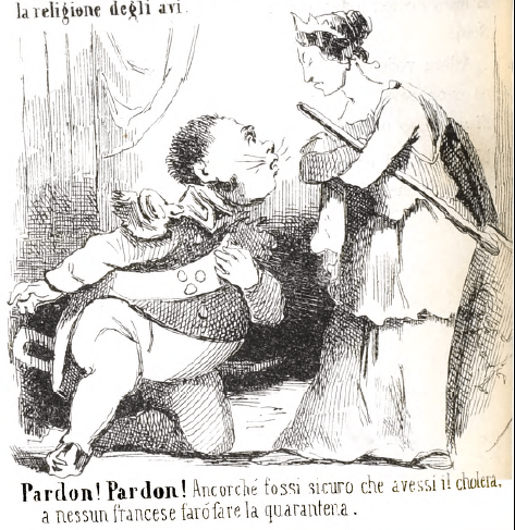 “What do you mean, you want to force me to quarantine at the Spanish border?” “Your majesty will pardon us, Sire, we are only carrying out your orders. You have imposed a quarantine on all travelers coming from countries infested by cholera or plague…” “Well!” “But, Sire, your Majesty is coming from France and could bring us the republic.” (Le Triboulet, Paris, 1883)