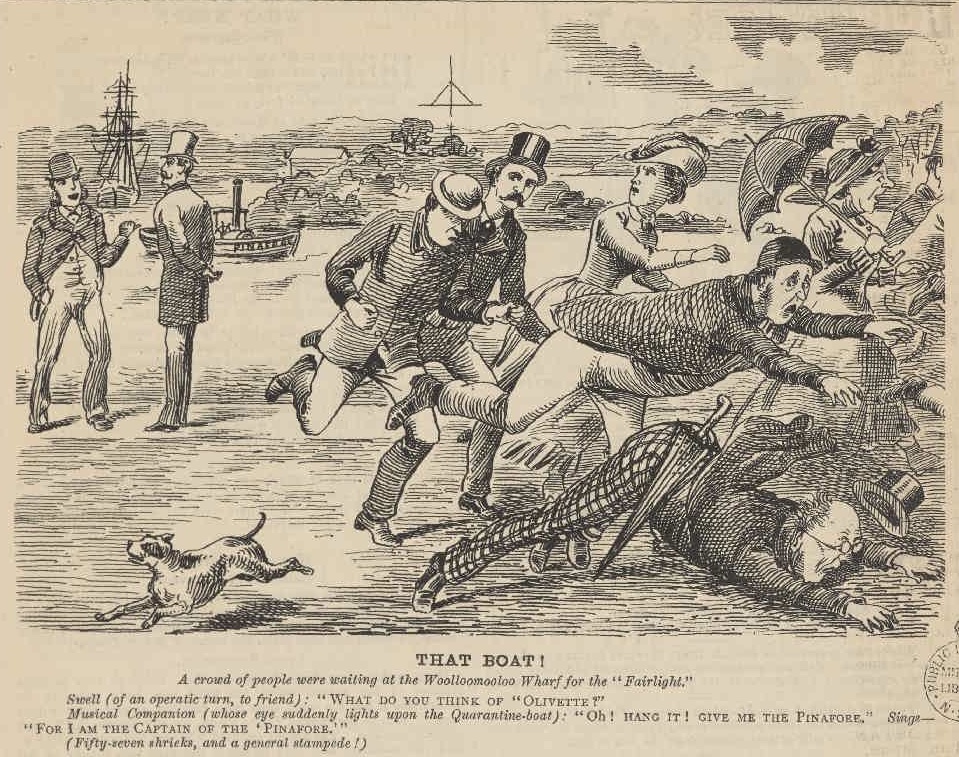 In 1881 Sydney, Australia, suffered a smallpox epidemic whose earliest infections likely stemmed from China, with the authorities once again resorting to strict quarantine. In this cartoon the nervousness about harbor connections to ships quarantined offshore invited a play on a Gilbert & Sullivan ditty. (Sydney Punch, 1881)