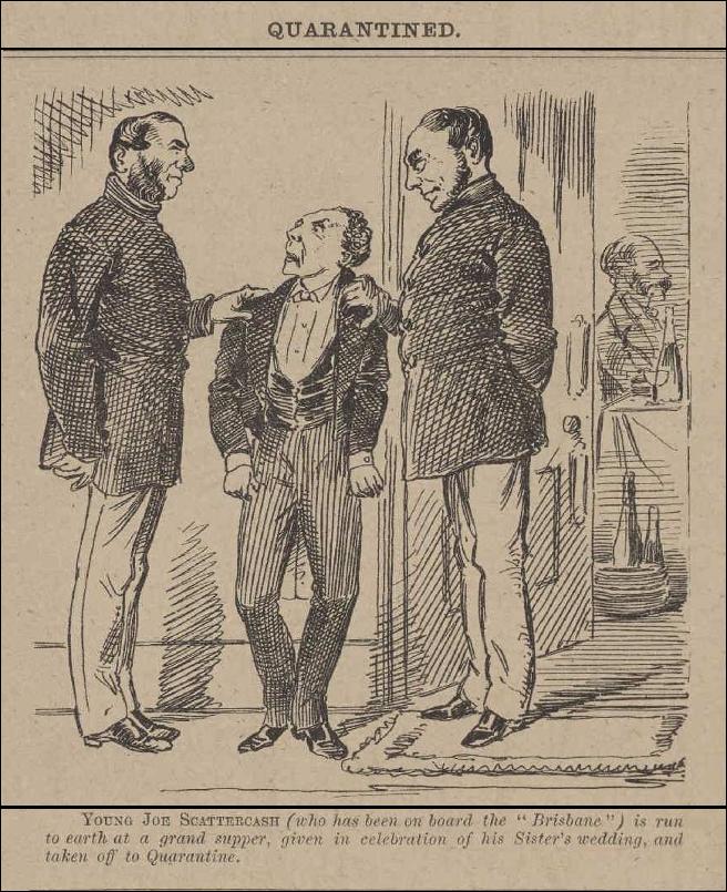 Young John Scattercash (who has been on board the “Brisbane”) is run to earth at a grand supper, given in celebration of his sister’s wedding, and taken off to quarantine. (Sydney Punch, 1877) (When Sir Arthur Kennedy, newly appointed as governor of Queensland, arrived on the steamer Brisbane from Hong Kong in March 1877, a “Chinaman” on board was found to be infected with smallpox. The ship and its hundreds of Chinese passengers were held in quarantine in Moreton Bay, but the political authorities dithered about whether Kennedy and his entourage should be exempted. A special medical commission was created to adjudicate, but this was widely dismissed as merely buying time to downplay a potentially unpopular decision that would be, at root, political. “The people of Australia are looked upon in England as being a trifle too democratic, as inclined to pay too little respect to high rank or exalted dignity,” proclaimed The Brisbane Courier. “It is reserved for the Imperial authorities to lower the state which has always been accorded to the Governor of Queensland, by sending us one, traveling to assume his Government, as a passenger on a merchant steamer crowded with hundreds of Chinese coolies… We have, however, a decided right to object to any relaxation of the precautions usually deemed necessary to prevent the landing of smallpox on our shores.” According to Krista Maglen, Australia favored quarantine as a tool of disease prevention well after Britain had abandoned this tactic, and not only for reasons of geographical isolation. This image makes clear the strong resonances with questions of class which quarantine also excited.)