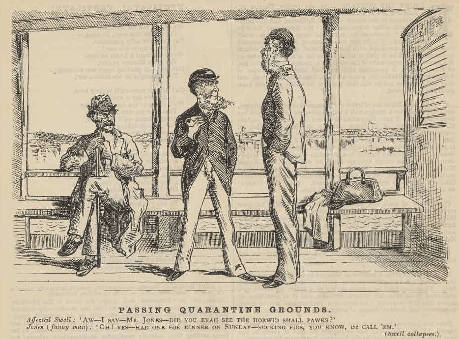 Affected Swell: “Aw–I say–Mr. Jones–did you evah see the horwid small pawks?” Jones (funny man): “Oh! Yes–had one for dinner on Sunday–sucking pigs, you know, we call’ em.” (Swell collapses) (Sydney Punch, 1881)