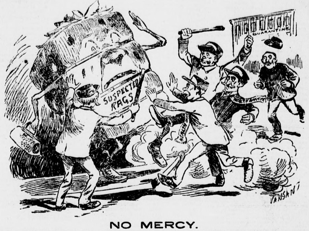 Public health officers are depicted beating away at rags suspected of bearing contagion. This issue contained extensive coverage of the advance of cholera in Europe and the preparations of New York public health authorities for its possible arrival on American shores. (The Evening World, New York, 1892)