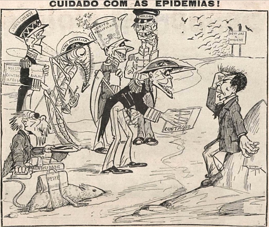 Rio’s poor: “Misericordia! The ambassadors of death are already at the door! [tuberculosis, mendicancy, plague, yellow fever, fake milk, cholera] What kind of diplomacy should I adopt now to drive out such a dangerous band? I will scream and complain at the top of my lungs before tuberculosis destroys us: To arms!”