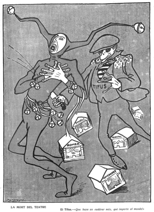 Typhus: “What does one more corpse matter to the world!” (Major theaters closed as typhus knifes a harlequin in the back.)