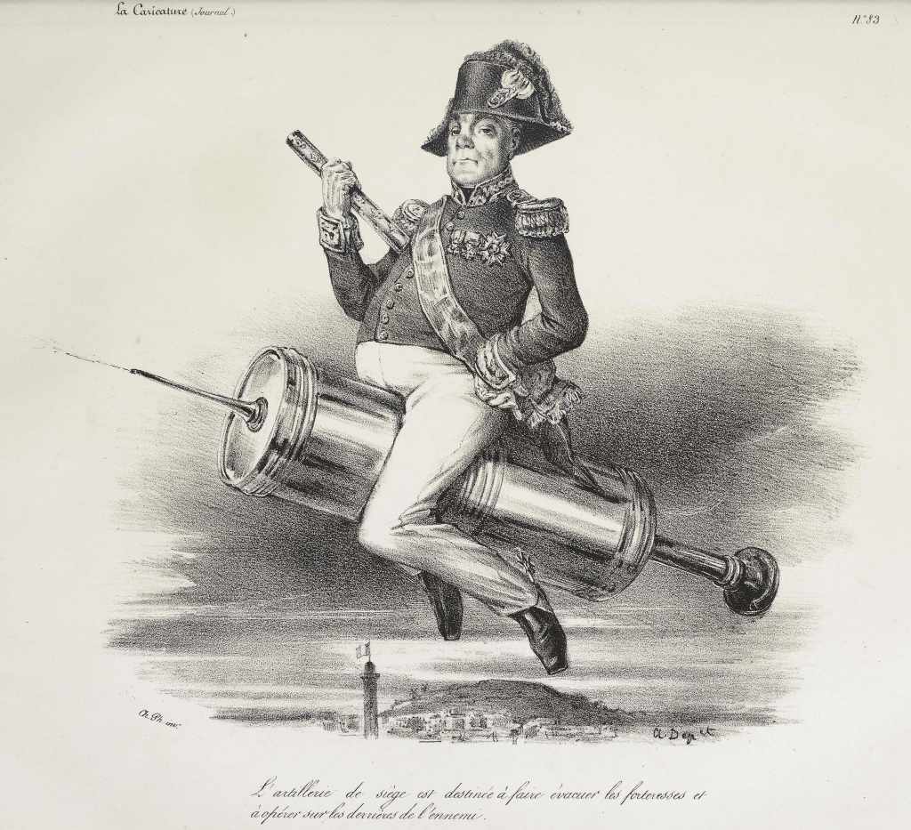 The siege artillery is intended to evacuate the fortresses and to operate on the rear of the enemy. (The general is mounted on a clystère or syringe suitable for enemas, which turns out to be a recurrent theme of contemporary French political satire.)