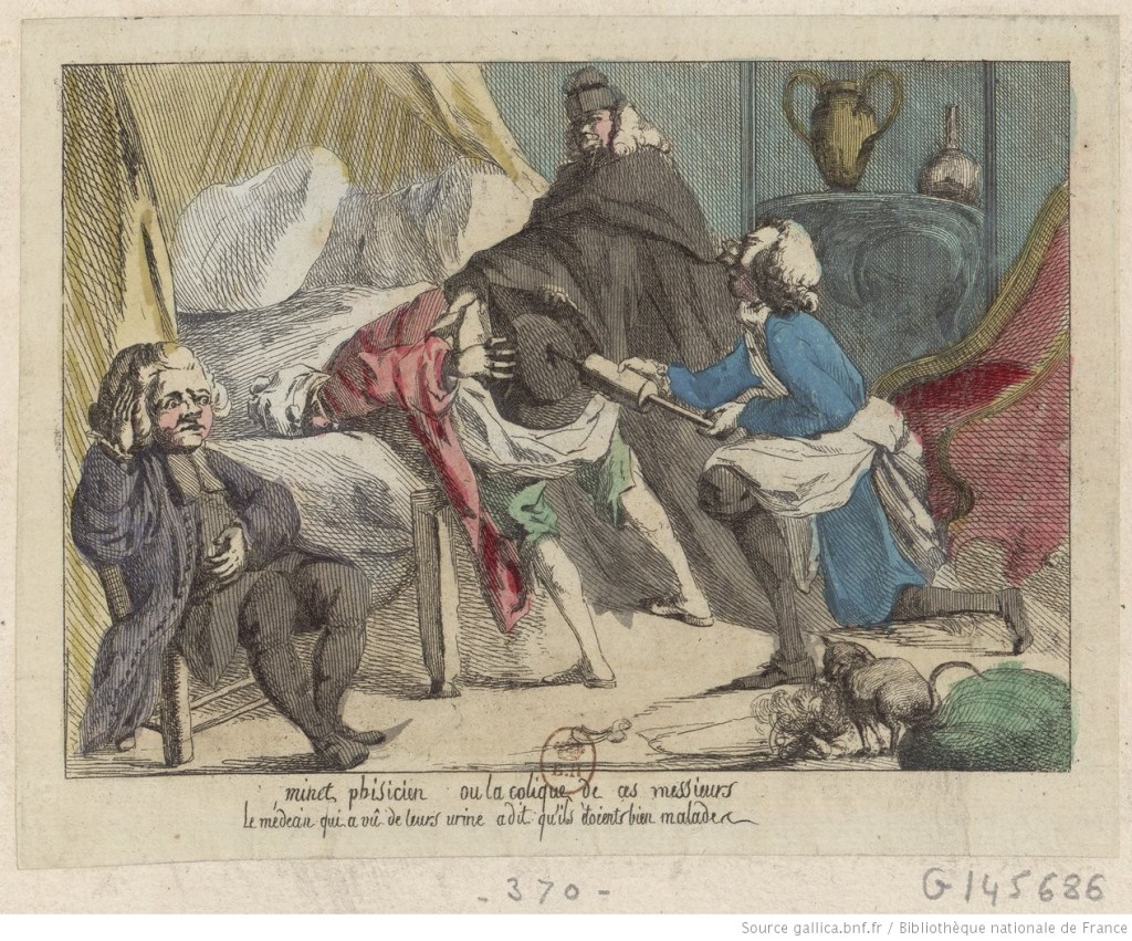 The earliest French clystère cartoon I’ve found is entitled “Trendy physician, or the colic of those medical gentlemen who have seen their urine and said that they are very sick.” (via Gallica, 1784)