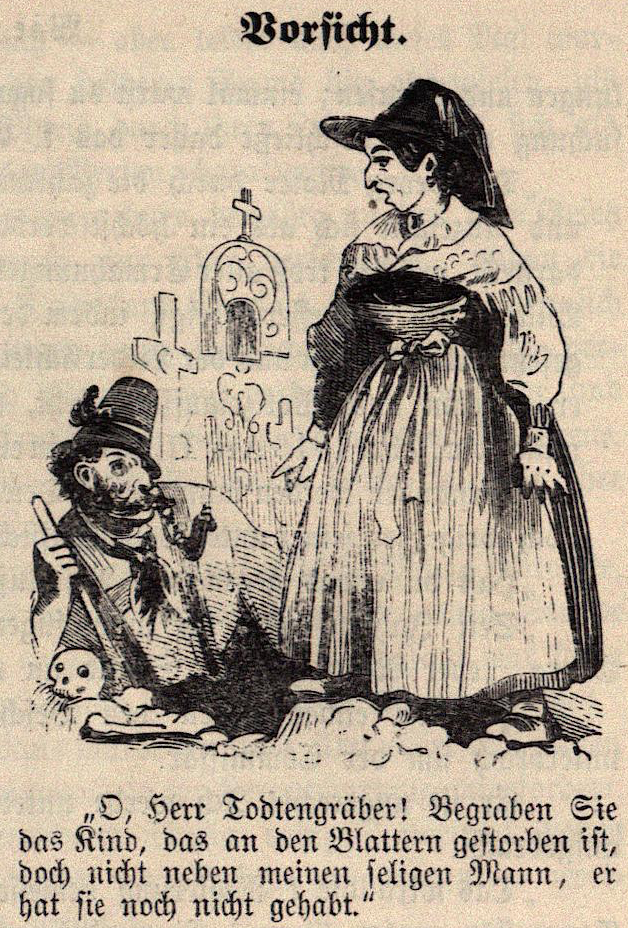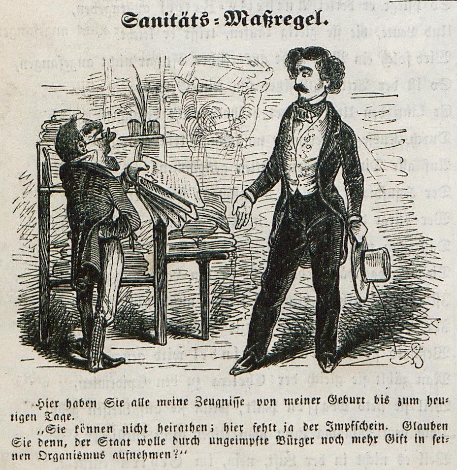 “Here you have all my documents from birth to the present day.” “You cannot get married; this is missing a vaccination certificate. Do you really think the state wants to absorb even more poison in its organism via unvaccinated citizens?” (Leuchtkugeln, Munich, 1848)