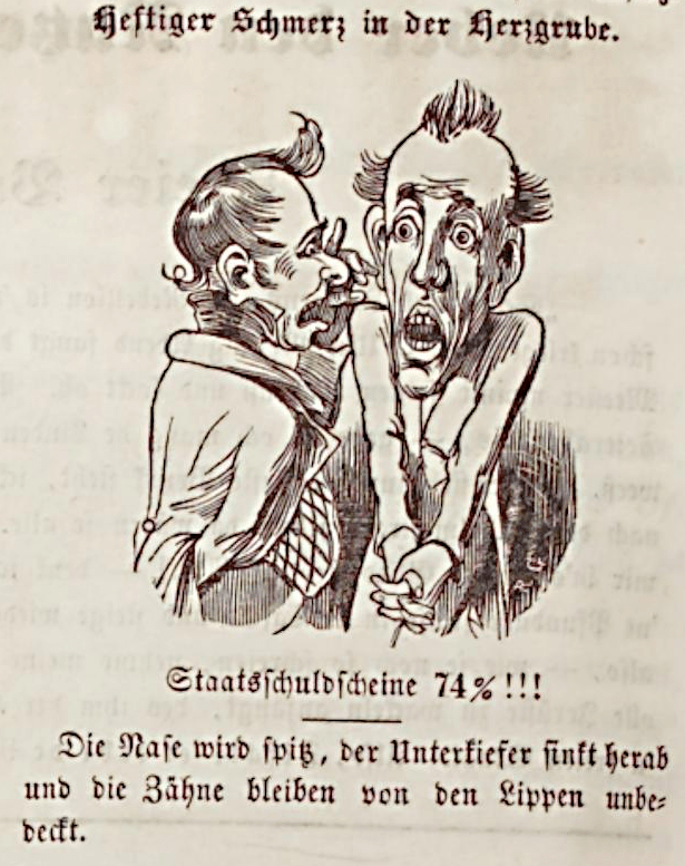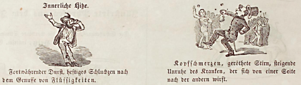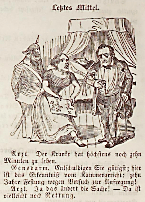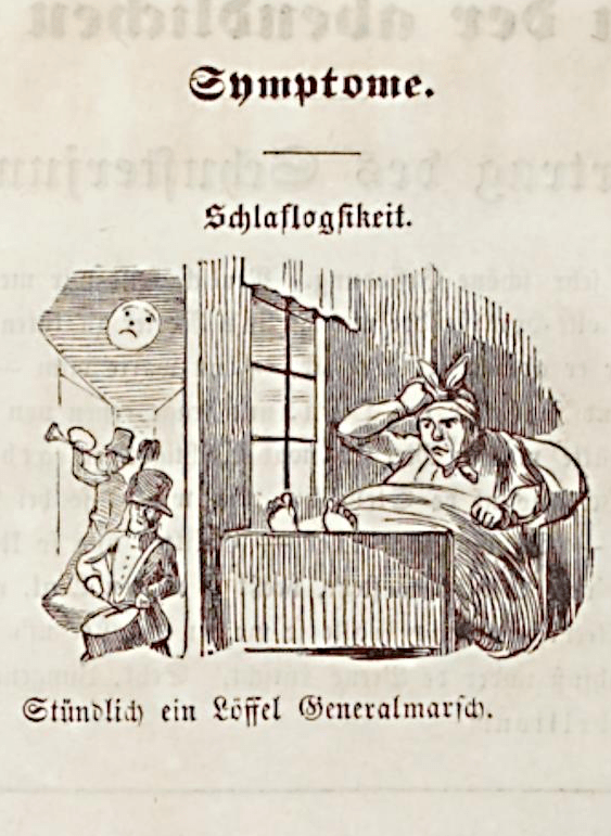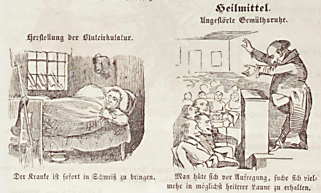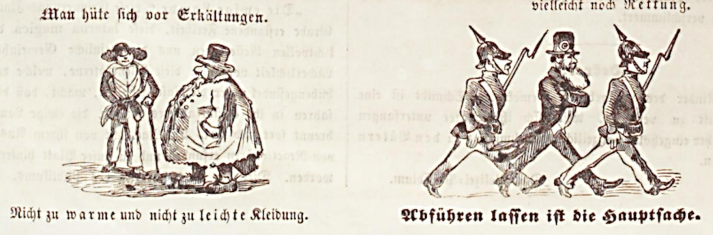 Popular lessons about the occurrence and fight with this contagion. (text by August Ritter, drawings by Wilhelm Scholz, Kladderadatsch, Germany, 1848)