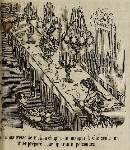 A mistress of the house has to eat alone a dinner prepared for forty people. (No doubt punning on “quarantine.”)
