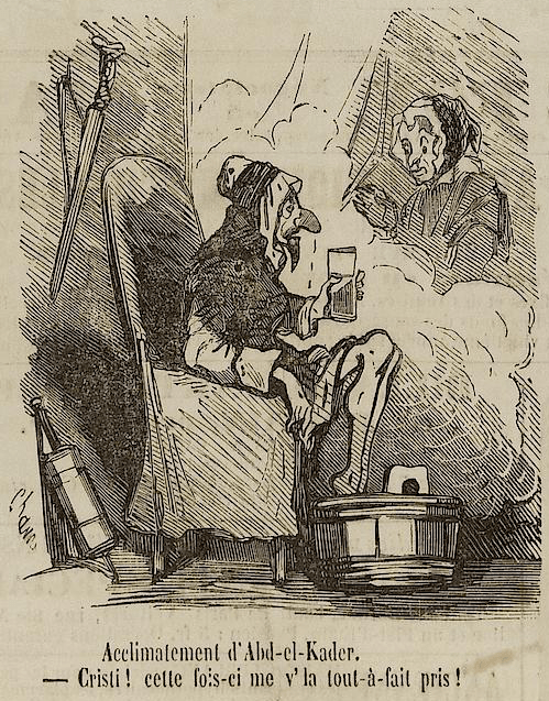 Acclimatization of Abd-el-Kader. (Algerian military leader then held captive by the French. Note the clystère in the background, a familiar French theme.) “Cristi! This time here I am completely taken!”