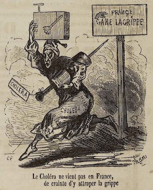 (I can’t make out the main title, though the last word might imply “undoing.”) Mr Cholera (in travel clothes): Good day, Mr Public Health Authority! Mr Public Health Authority: Snore! Mr Cholera: But, man! The clock is ticking, it is high time to get up; I have already eaten lunch with the Citizens’ Representatives; hey there! up! Mr Public Health Authority: Snore! Mr Cholera: Oh, then snore till doomsday! Whoever the hell has to stand it longer and shake the late riser. Auf Wiedersehen, Mr Colleague! Mr Public Health Authority: Snore! (Corsaren, Copenhagen, 1848) (Definitely needs improvement.)