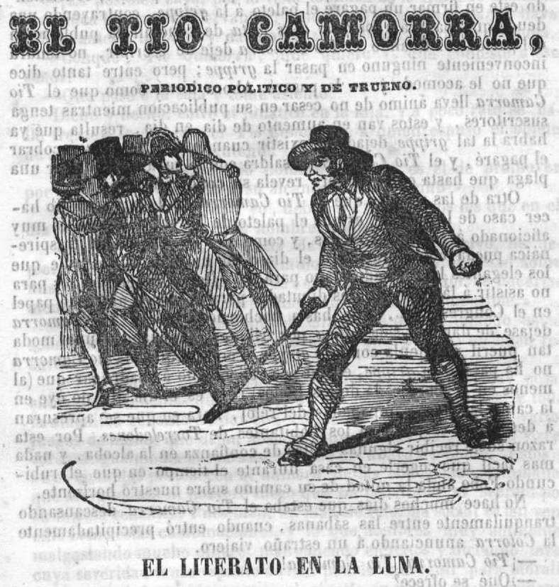 “Uncle Trouble has not wanted to catch the flu until now, and has had more than one reason for it. The first and foremost of all is that Uncle Trouble has a great commitment contracted with the Spanish public, and he does not want his beatings to suffer interruption [see image], I do not say for something so mean and petty as having the flu, but for all typhus and cholera around the world. So, then, although the prevailing disease has penetrated the home of the citizen of Torrelodones [i.e., JMV’s alter ego] and resolutely attacked Don Juan de la Pilindrica [his worldly mentor] and the Parrot [another prop in his dialogues], and for other instances that the flu has undertaken to meet with Uncle Trouble, this one has categorically refused to receive it, as he is willing to reject any epidemics that arise while the yokel [meaning Uncle Trouble] pursues the noble and holy mission of enlightening the people and unmasking the public villains. And in order for the flu to desist from its reckless endeavor, it was necessary to reach a compromise in the most prudent way possible, which consisted of the yokel signing a promissory note to the flu, contracting a debt that will be paid within eight days after the publication is completed. When Uncle Trouble stops writing, there will be no problem for anyone to get the flu; but meanwhile he says that it does not suit him and he will not get it. Having said that, as Uncle Trouble has the courage to not stop publishing as long as he has subscribers, and these are increasing from day to day, it turns out that the flu will no longer exist when he wants to come to collect the bill, and Uncle Trouble will get away with not getting a plague that even in name [“la grippe”] reveals his French condition.