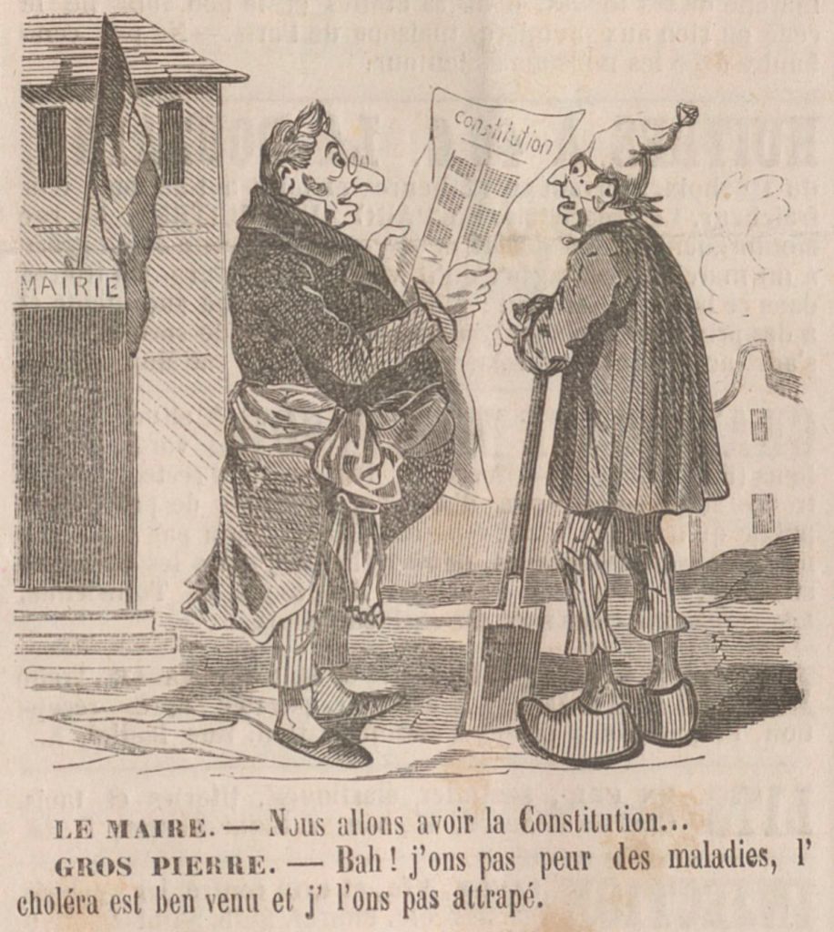 (Following months of revolutionary activities throughout France and Europe, the National Assembly adopted a constitution in November 1848. Scarcely three years later, Napoleon Bonaparte’s coup d’état was soon followed by another constitution establishing the Second Empire.) The Mayor: “We will have the Constitution…” Big Pierre: “Bah! I’m not afraid of such maladies, cholera has come along and I haven’t caught it.” (Le Charivari, Paris, 1848)