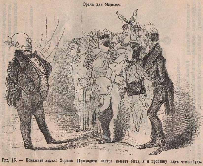 “Stick out your tongue! Fine. Come tomorrow, perhaps I’ll prescribe something for you.” (Both influenza and cholera were present in St. Petersburg when this was published in one of Russia’s first illustrated satirical journals.) Mikhail Nevakhovich in Yeralash, c. 1848. (Reprinted in Aleksandr Shvyrov’s Illustrated History of Caricature, 1903)