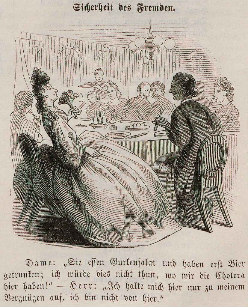 Lady: “You are eating cucumber salad and drank your beer first; I wouldn’t do that here where we have the cholera!”