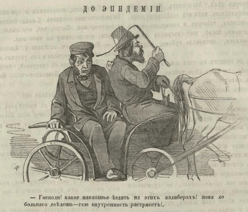 Cholera: “Brother, I did not expect such a reception: no one was afraid of me, and they are even dogging me at every step. You can’t show your face anywhere: either I’ll run up against vitriol, or the Zhdanov brothers [purveyors of a sulphuric deodorant concoction since the 1840s; “Zhdanov liquid” was indeed tested for its effects on cholera and typhus in 1893]. But there was a time when I wasn’t greeted like this: I was given lots of leeway.”