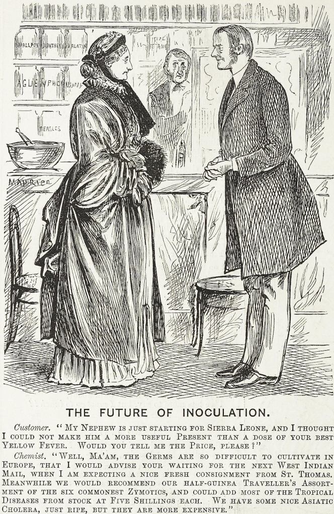 In 1881 Sydney, Australia, suffered a smallpox epidemic whose earliest infections likely stemmed from China, with the authorities once again resorting to strict quarantine. In this cartoon the nervousness about harbor connections to ships quarantined offshore invited a play on a Gilbert & Sullivan ditty.