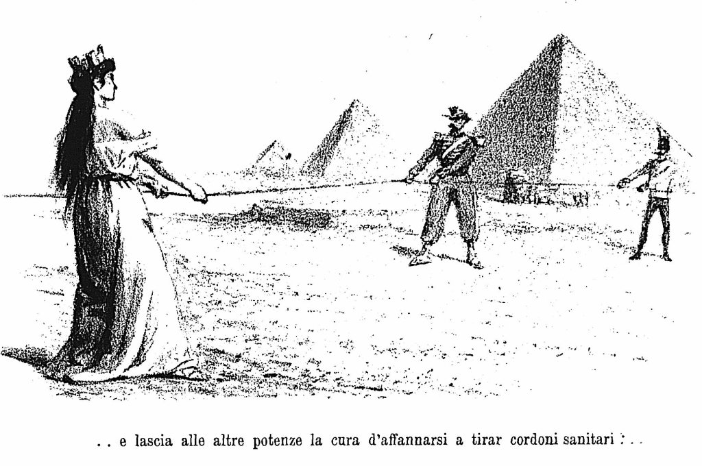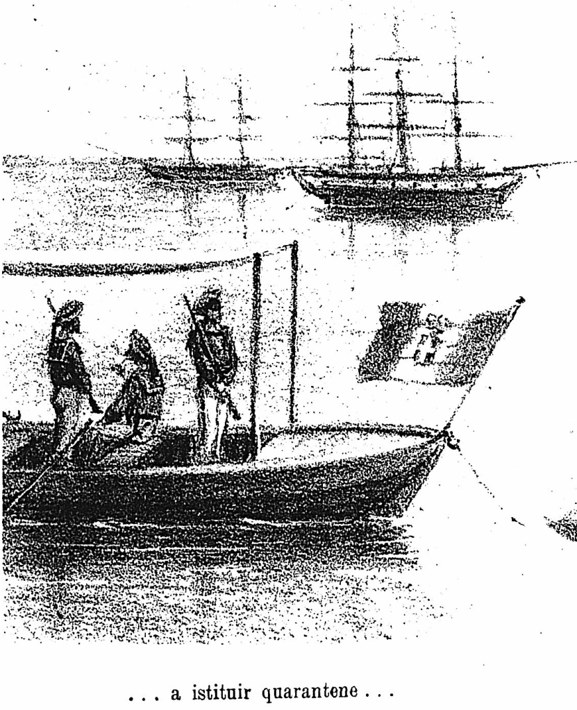 “What do you mean, you want to force me to quarantine at the Spanish border?” “Your majesty will pardon us, Sire, we are only carrying out your orders. You have imposed a quarantine on all travelers coming from countries infested by cholera or plague…” “Well!” “But, Sire, your Majesty is coming from France and could bring us the republic.” (Le Triboulet, Paris, 1883)
