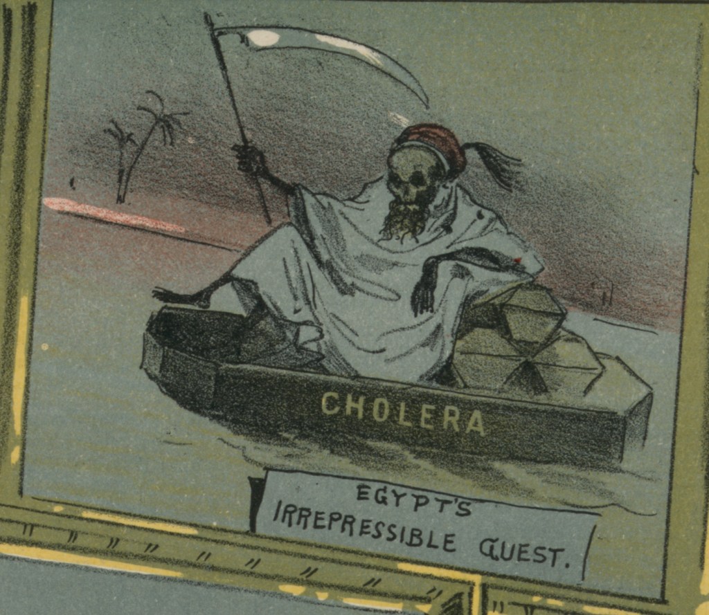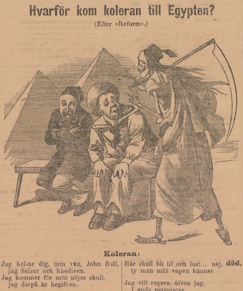 Cholera: I greet you, my friend, John Bull, and I greet the khedive. I come for my pleasure, I am then besotted. I think you’re sitting here and still just bored. Today I have therefore come so we may be together. None of you invited me here, I invite myself, friends. There will be life and desire here… no, death, for you know my weapon. I want to rule, even I, in good potentates. When I strike, I strike powerful blows, then proud states tremble. I have an irresistible power, and here, so bright and sunny, we must now dance to the beat and have so much fun. (Fäderneslandet, Stockholm, 1883)