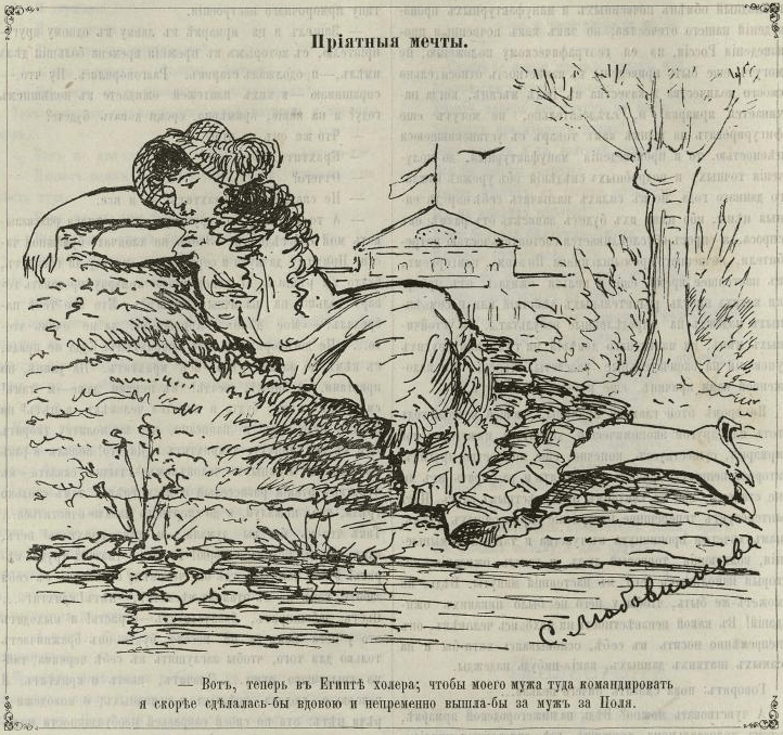 “Now there’s cholera in Egypt; were my husband to be assigned there, I would quickly be made a widow and immediately get married to Paul.” (Razvlechenie, Moscow, 1883)