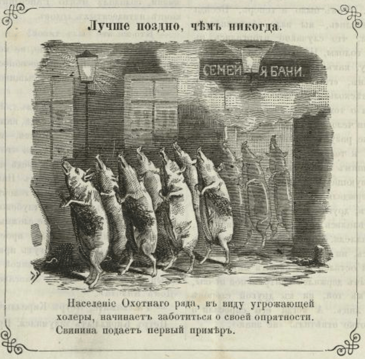 The population of Hunter’s Row [in central Moscow], in view of the cholera threat, are starting to take care about their cleanliness. Swine provide the prime example [passing through a Moscow sauna]. (Several years later the municipal authorities would construct a major public abattoir, motivated in part by public health concerns, as you can learn from the work of Anna Mazanik.) (Razvlechenie, Moscow, 1883)