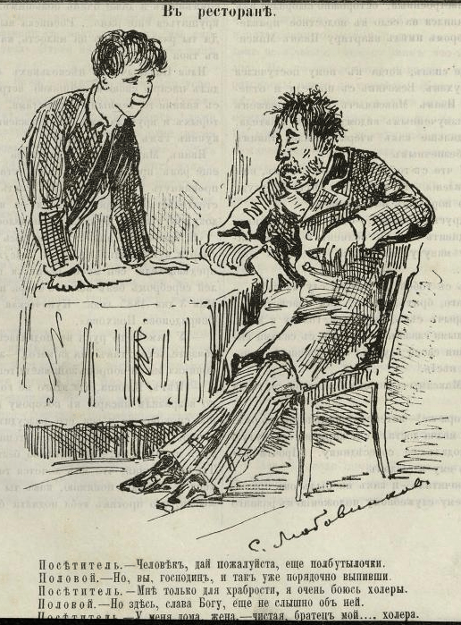 Visitor: “Man, gimme another half bottle, please.” Waiter: “But you, sir, are already properly soused.” Visitor: “It’s just for courage, I’m really afraid of cholera.” Waiter: “But thank God we haven’t heard anything about it here.” Visitor: “At home my wife is clean, and my brother is… cholera.” [presumably the usual wordplay about “choleric”?] (Razvlechenie, Moscow, 1883)