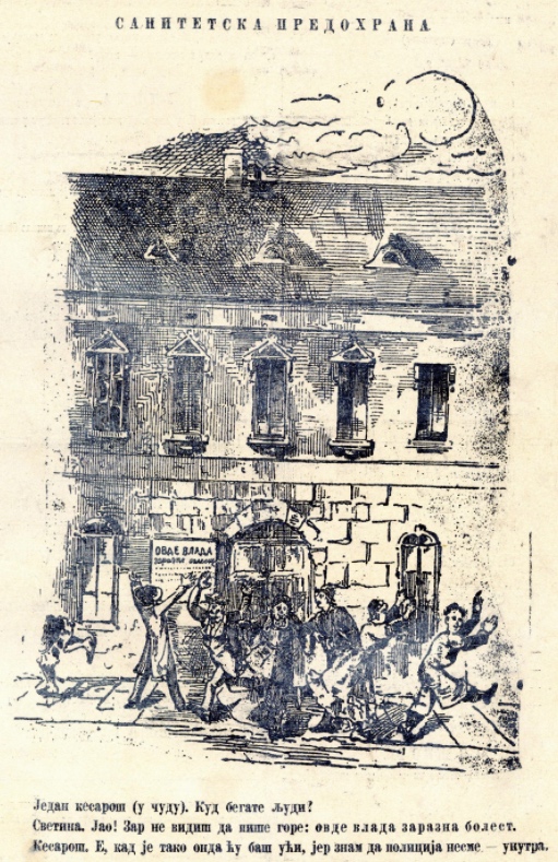 A pickpocket (in wonder): “Where are people running?” Crowd: “Alas! Can’t you see it says above: a contagious disease reigns here.” Pickpocket: “Well, if that’s the case, then I’ll just go in, because I know the police can’t go inside.” (Telefon, Belgrade, 1883)