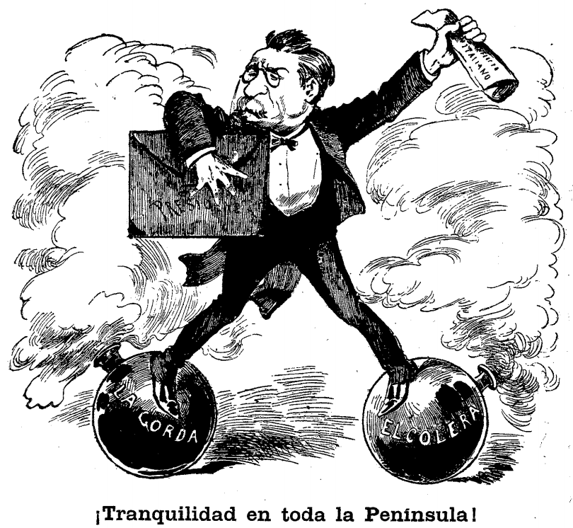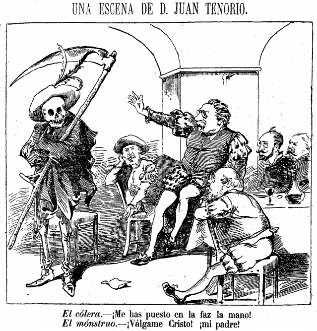 Don Juan Tenorio (the Seducer) was a 1844 play by José Zorrilla that retold the Don Juan legend for modern Spanish audiences. The object of satire here is prime minister Antonio Cánovas del Costillo, sometimes referred to as “the monster” for his curious combination of intellectual hauteur and political brutality. Cholera: “You have slapped me in the face!” [i.e., “I demand satisfaction!”] The monster: “Christ almighty! My father!” (El Busilis, Barcelona, 1884)