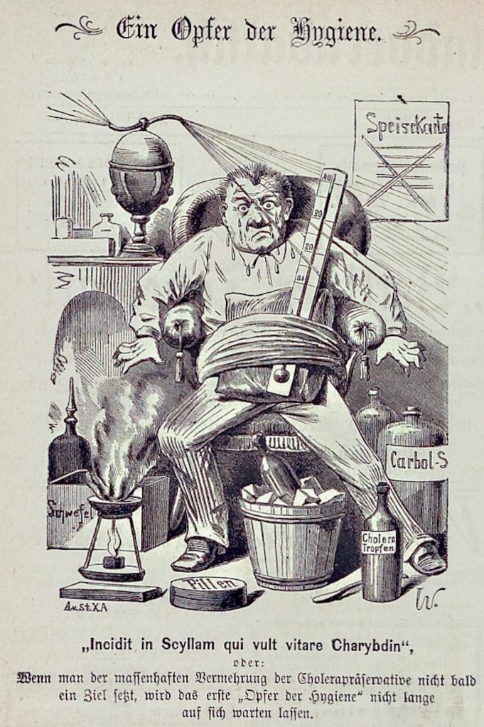 (in Latin) He wants to avoid falling into Scylla or Charybdis, or: Unless a guideline is set soon for the massive increase in cholera-prevention remedies, the first victim of hygiene will not be long in coming. (Kladderadatsch, Berlin, 1884)