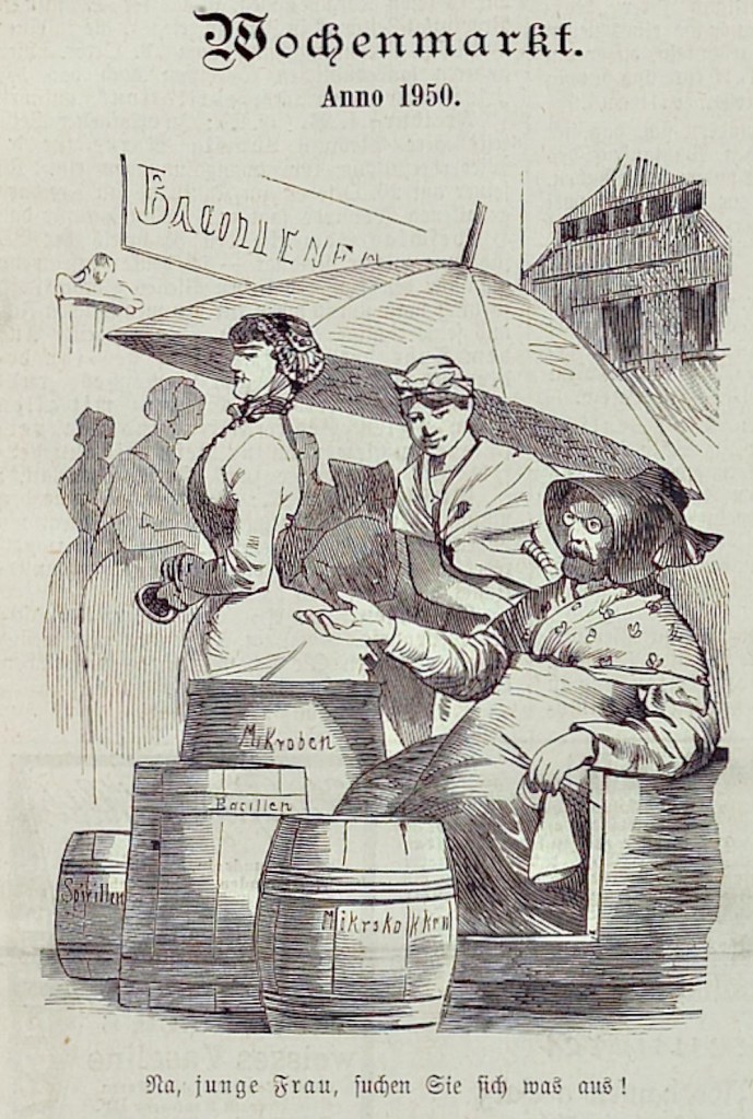“Juicy, well-fed bacteria freshly served at all times.” (Resoundingly disastrous success guaranteed.) The Koch Bacteria Pub (Max Pettenkofer was a famous Bavarian hygienist whose environmental explanations of disease were then in the process of being eclipsed by the new germ theory, of which Robert Koch was perhaps the most famous German proponent. This cartoon appeared just as the fifth cholera pandemic was cresting in Europe.) (The caption is cropped from this image; see link for original text.) (Berliner Wespen, Berlin, 1884)