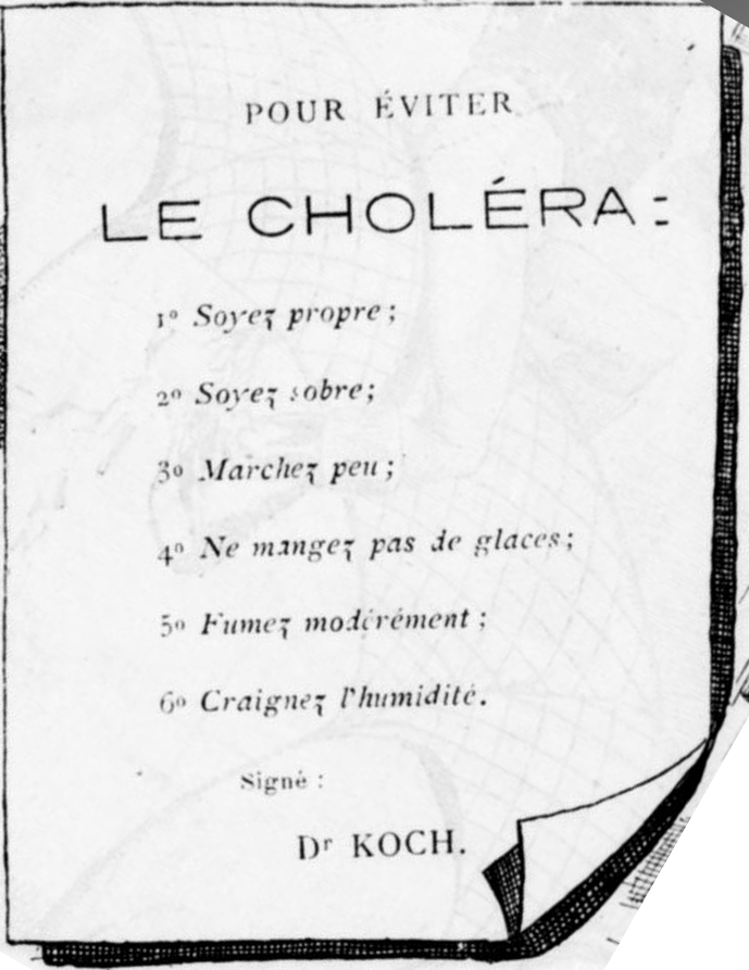 To avoid cholera: 1. Be clean 2. Be sober 3. Don’t walk too much 4. Don’t eat ice cream 5. Smoke in moderation 6. Beware of humidity (signed) Dr. Koch