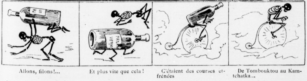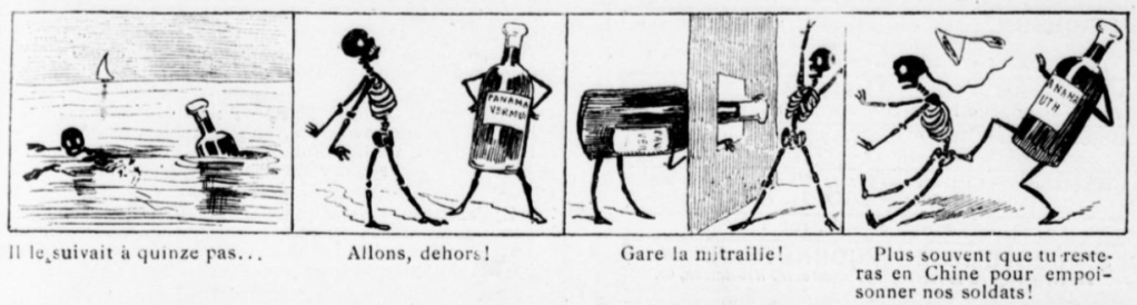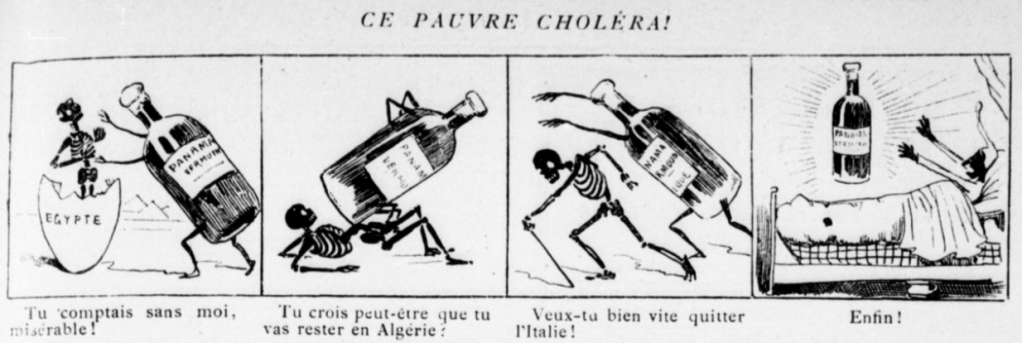 You didn’t count on me, wretch! You thought you might be able to take a break in Algeria? Would you like to leave Italy soon! Finally! (What the Panama Vermouth pursuing the cholera figure is meant to signal is not entirely clear to me, but at the height of French attempts to dig a canal through Panama, huge quantities of quinine were consumed to fight tropical diseases, and it was common to dissolve sulphate of quinine in vermouth for consumption every morning before breakfast.)