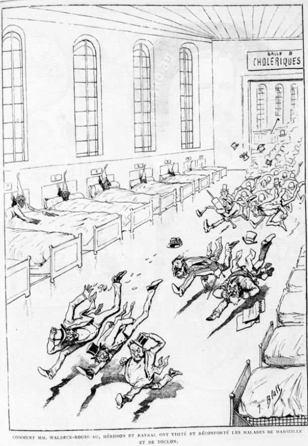 How Mr. Waldeck-Rousseau, Mr. Hérisson, and Mr. Raynal visited and comforted the sick in Marseille and Toulon. (Le Triboulet, Paris, 1884) (Waldeck-Rousseau was minister of the interior, Hérisson was minister of commerce, and Raynal was minister of public works in the government of Jules Ferry.)