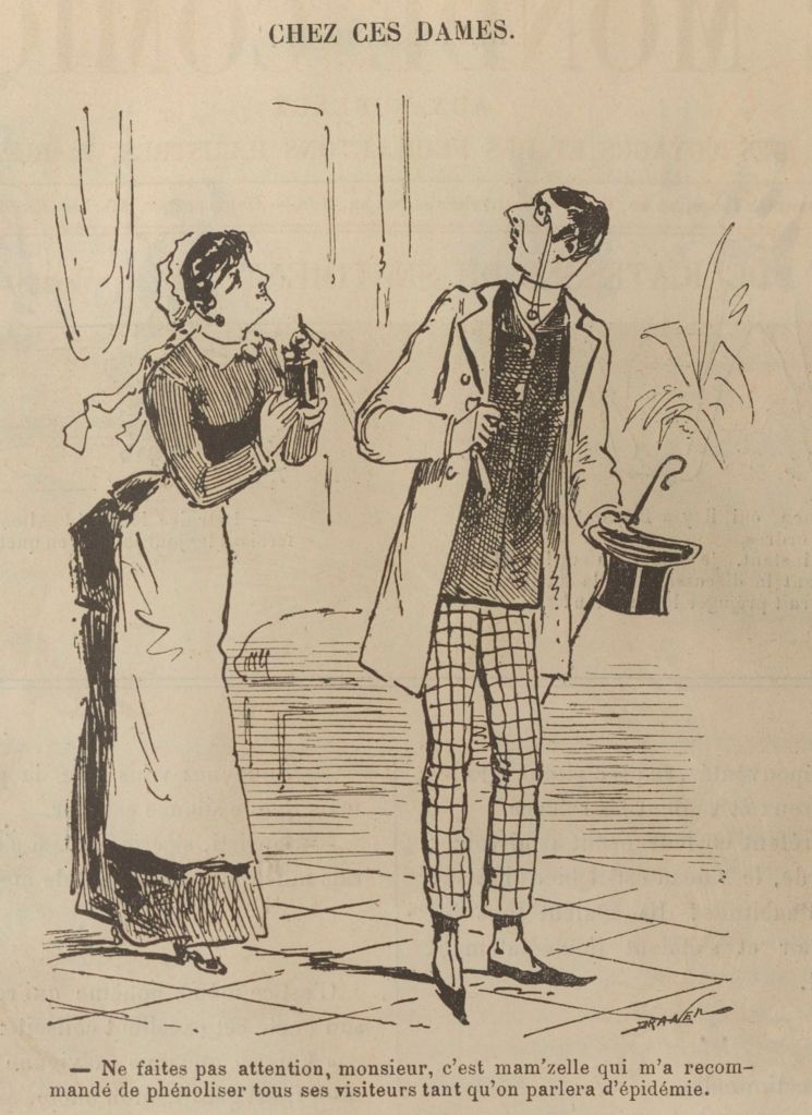 “Pay it no mind, sir, it’s the missy who recommended that I phenolize all her visitors as long as there’s talk of an epidemic.” (Le Monde comique, Paris, 1884)