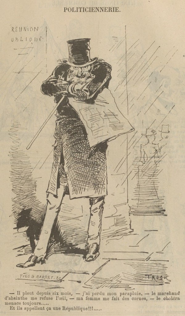 It has been raining for six months, I lost my umbrella, the absinthe merchant refuses to look me in the eye, my wife is stepping out on me, cholera is still threatening… And they call this a Republic!!! (Le Monde comique, Paris, 1884)