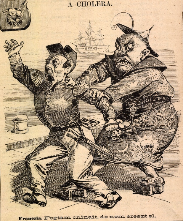 Marfuga is an olive oil producing region in Perugia, but I have no idea what the title signals. The individual panels in this cholera cartoon are amusing, however, mocking the urge to flee Barcelona for the countryside when news arrives of cholera in the French port of Toulon. (Apologies for the inept translations.)