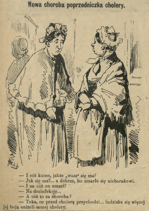 “And godmother dear, how’s your man?” “How’s he doing? … well, fine, because the poor devil has died.” “And what did he die from?” “From disinfection.” “What kind of disease is that?” “The one that comes before cholera… people are more afraid of it than cholera itself.” (Mucha, Warsaw, 1886) See also these miasmatic contemporary images of disinfection measures at Paris train stations (and again in 1892).