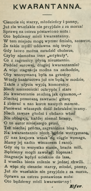 Rejoice, elders, lads and ladies, No longer do all evils come from abroad! Matters have come to a head: We are going to have quarantine here. In this place I can say boldly, sincerely, That such thoughts have long troubled me: If cholera can easily be remedied, Wouldn’t it be possible to subject other “goods,” From what is constantly flowing from abroad, To strict and lengthy quarantine? And namely stagnation is fashionable in the west, May it be stopped at the border; Then bankruptcies will no longer be in vogue, Bailiffs will also fall out of use. May the hoarse old sirens of stagnation Dry out like cinnamon on quarantine, May they stop plaguing us on the guitar And collecting bundles of money from us. Because we have enough beggars. May the ever hungry and ragged Italians Not besiege almost every gate, That is what this author asks for. May stagnation also be a vain, foreign sham, Let it be subject to quarantine, (In Poland it is indeed still increasing, Day and night we have it in excess). If all this happens, dear brothers, We will be able to call out: tralala! Stagnation will escape to the woods And all poverty will disappear in an instant. So rejoice: elders, lads and ladies, No longer do all evils come from abroad, Matters have come to a head: Here we will have quarantine!