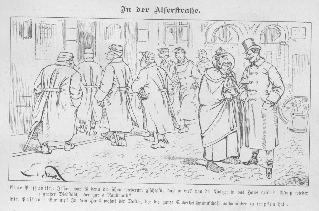 Lady passing by: “Goodness, what’s happening around there again, that so many police are going into that house? It’s got to be another big burglary, or even a robbery?” Man passing by: “Not at all! In that house lives the doctor who has to vaccinate the entire security team…” (Figaro, Vienna 1886)